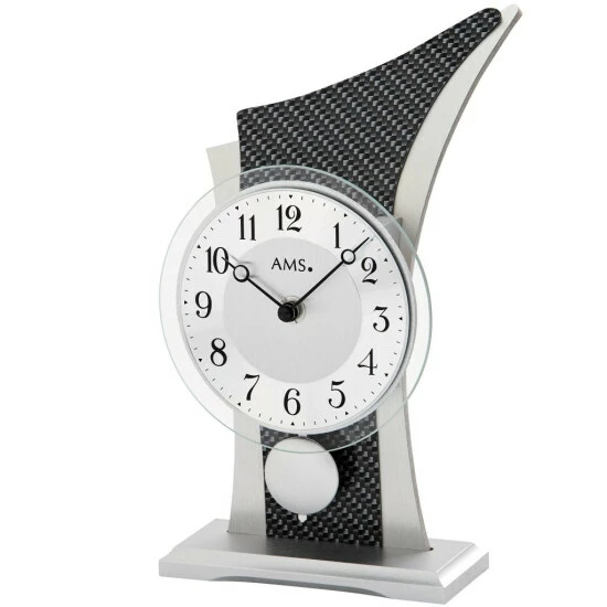 AMS 1140 Tischuhr Quarz mit Pendel silbern Carbon Optik geschwungen mit Glas