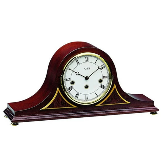 Tischuhr, Gehäuse Mahagoni, gewölbte Glaslünette, 8-Tage 4/4 Westminster Schlagwerk mit Schlagabstellung, Höhe ca. 21 cm, Breite ca. 43 cm, Tiefe ca. 13 cm