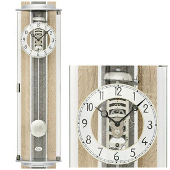 Regulateur mit Pendel, mechanisch, Holzgehäuse in Sonoma-Optik mit Naturstein und Aluminium-Veredelung kombiniert, geschwungenes Mineralglas, 8-Tage Schlagwerk mit Schlag auf Glocke zur vollen Stunde, Aluminium-Zahlenring, Strichskala, arabische Zahlen und Zeiger schwarz, mit Schlüsselfach, Höhe ca. 77 cm, Breite ca. 21 cm, Tiefe ca. 15 cm