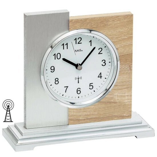 AMS 5151 Tischuhr Funk silbern modern Holz Sonoma Optik mit Aluminium Auflage