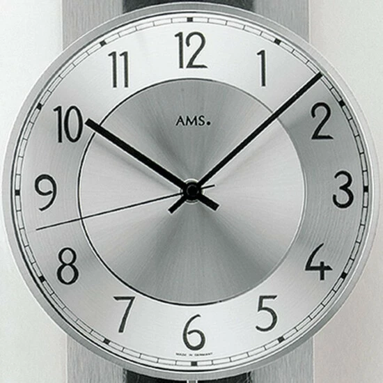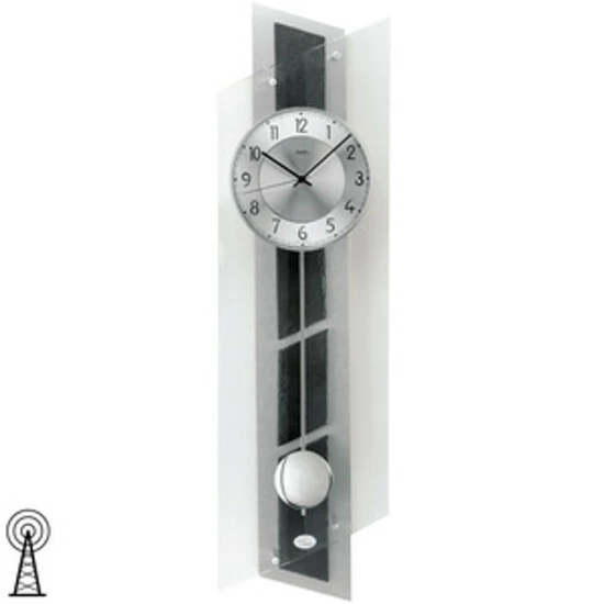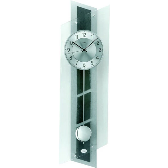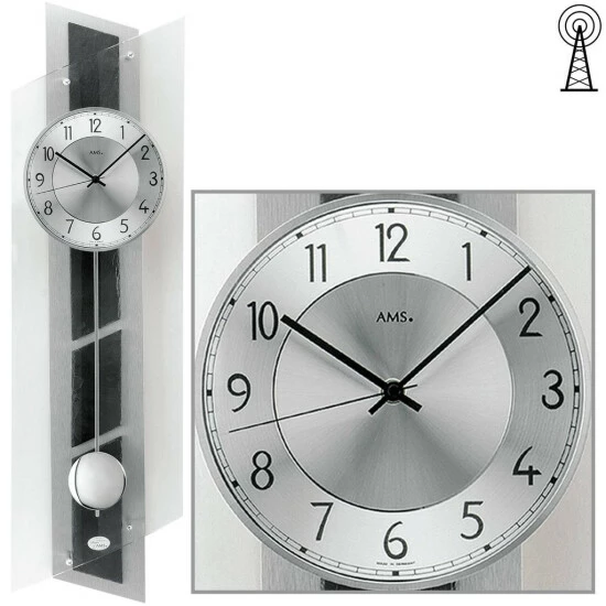 AMS 5217 Wanduhr Funk Funkwanduhr mit Pendel silbern Pendeluhr Glas und Schiefer