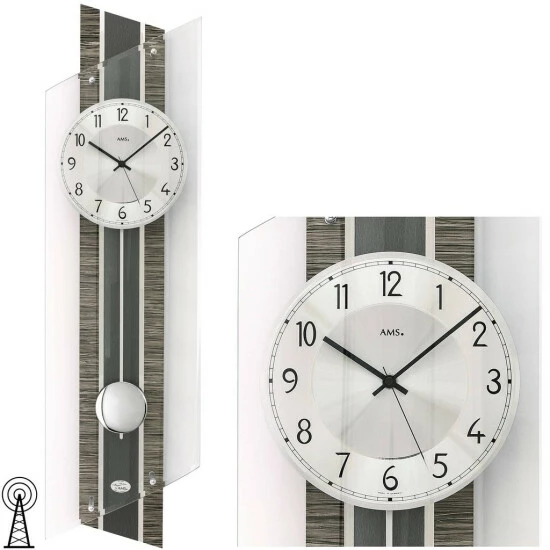 Pendeluhr Funk AMS 5300 mit Funk-Pendelwerk, Holzgehäuse, Fossilstruktur/Aluminium-Veredelung, Aluminium-Zifferblatt und facettgeschliffenem geschwungenem Mineralglas