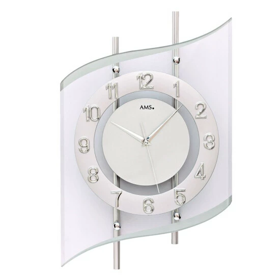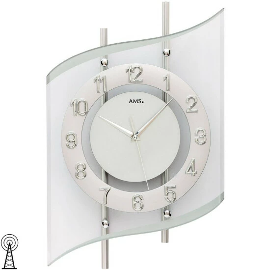 AMS 5506 Wanduhr Funk Funkwanduhr analog silbern modern geschwungen mit Glas