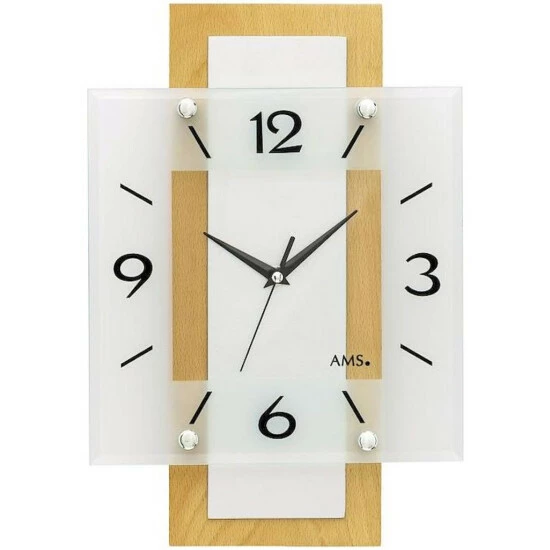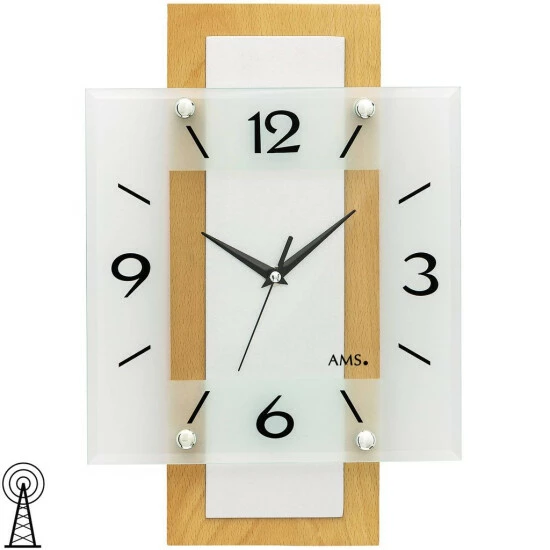 AMS 5507 Wanduhr Funk Funkwanduhr analog Holz Buche massiv eckig mit Glas