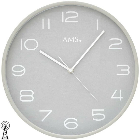 Wanduhr Funk AMS 5521 mit Funkwerk, Holzgehäuse silbergrau lackiert, bedrucktem Zifferblatt und Mineralglas