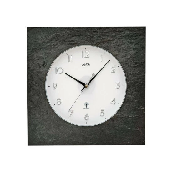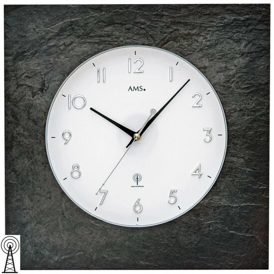 Funk-Wanduhr aus Naturschiefer, Mineralglas, weißes Zifferblatt mit aufgelegten, erhabenen, arabischen Zahlen silberfarben, Zeiger schwarz, Sekundenzeiger silberfarben, Höhe ca. 34 cm, Breite ca. 34 cm, Tiefe ca. 5 cm, Gewicht ca. 2126,7 g