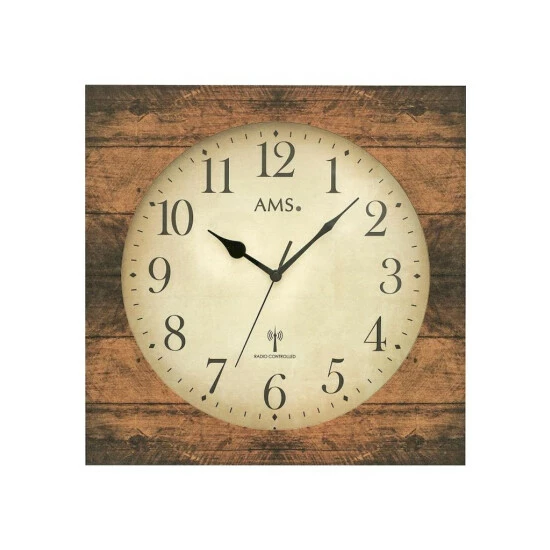 Funk-Wanduhr, Holzgehäuse braun, Mineralglas, cremefarbenes Zifferblatt, Strichskala, arabische Zahlen und Zeiger schwarz, mit Sekundenzeiger, Höhe ca. 34 cm, Breite ca. 34 cm, Tiefe ca. 5 cm, Gewicht ca. 950,0 g
