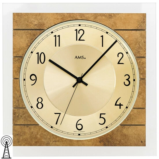 Funk-Wanduhr, Holzgehäuse auf satiniertem Mineralglas, mit Auflage in Antikmessing-Optik kombiniert, Aluminium-Zifferblatt messingfarben, Strichskala, arabische Zahlen und Zeiger schwarz, mit Sekundenzeiger, Höhe ca. 25 cm, Breite ca. 25 cm, Tiefe ca. 4 cm, Gewicht ca. 700,0 g