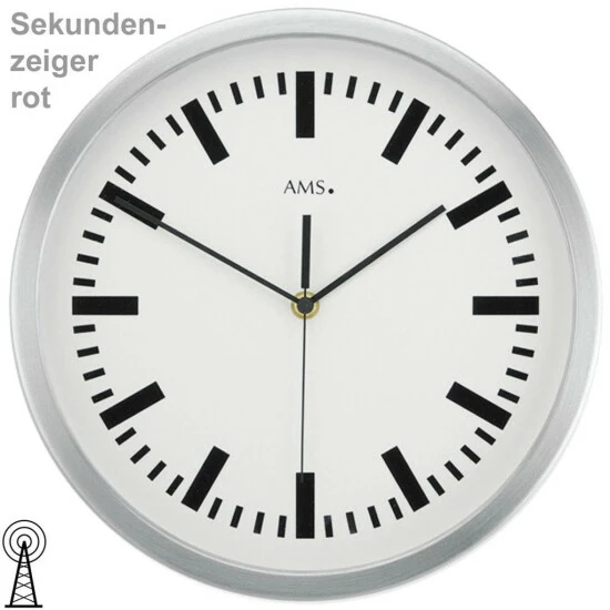 AMS 5840 Funk Wanduhr, Metallgehäuse aus gebürstetem Aluminium, Mineralglas, weißes Zifferblatt, Strichskala und Zeiger schwarz, Sekundenzeiger rot