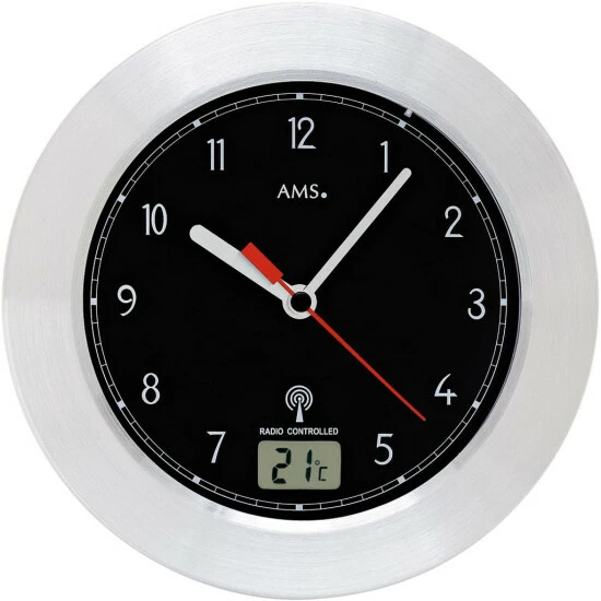 Funk-Badezimmeruhr, Aluminiumfrontreif, wasserdicht, mit digitaler Temperaturanzeige, schwarzes Zifferblatt, Strichskala, arabische Zahlen und Zeiger silberfarben, Sekundenzeiger rot, Durchmesser ca. 17 cm, Tiefe ca. 6 cm, Gewicht ca. 351,3 g
