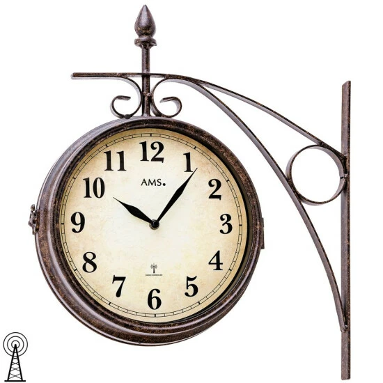 Funk-Wanduhr, Metallgehäuse braun, Mineralglas, cremefarbene Zifferblätter, Strichskalen, arabische Zahlen und Zeiger schwarz, Höhe ca. 44 cm, Breite ca. 40 cm, Tiefe ca. 10 cm, Gewicht ca. 2050,0 g