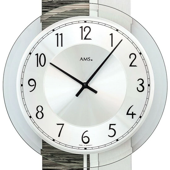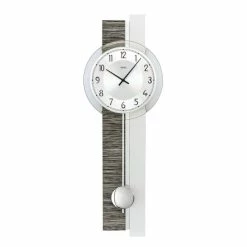 AMS 7439 Wanduhr Quarz mit Pendel silbern grau Holz Optik Pendeluhr mit Glas