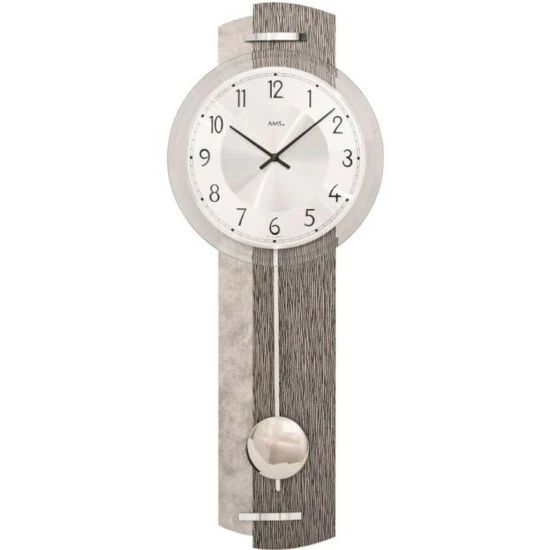 Quarz-Wanduhr mit Pendel, Holzrückwand mit Antik-Optik silberfarben und Wellen-Optik kombiniert, Aluminium-Zifferblatt auf facettiertem Mineralglas, Strichskala, arabische Zahlen und Zeiger schwarz, Höhe ca. 61 cm, Breite ca. 23 cm, Tiefe ca. 8 cm, Gewicht ca. 1463,0 g