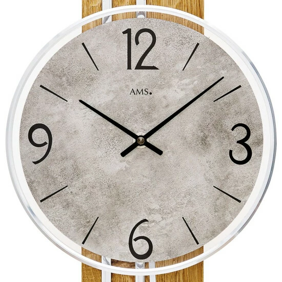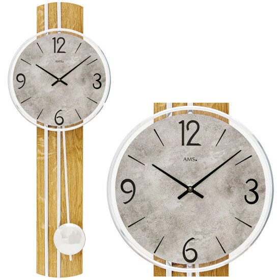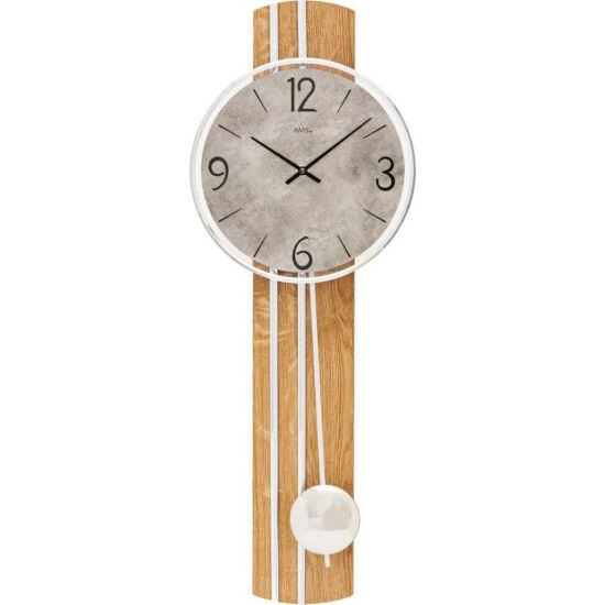 Quarz-Wanduhr mit Pendel, Holzrückwand in Wildeiche-Optik, Zifferblatt in in silberfarbener Antik-Optik hinter bedrucktem Mineralglas, Frontreif Aluminium, Strichskala, arabische Zahlen und Zeiger schwarz, Höhe ca. 60 cm, Breite ca. 22 cm, Tiefe ca. 8 cm, Gewicht ca. 1050,0 g