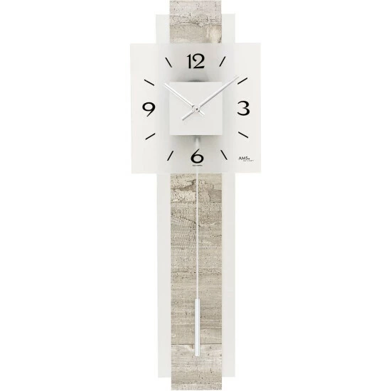 Quarz-Wanduhr mit Pendel, Holzrückwand in Beton-Optik mit Aluminium kombiniert, satiniertes Mineralglas-Zifferblatt, Strichskala und arabische Zahlen schwarz, Zeiger silberfarben, Höhe ca. 68 cm, Breite ca. 22 cm, Tiefe ca. 7 cm, Gewicht ca. 1200,0 g