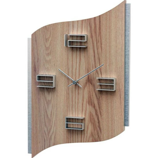 Quarz-Wanduhr, geschwungene Holzrückwand in Sonoma-Optik, mit Alumninium kombiniert, erhabene arabische Metallzahlen, Zeiger silberfarben, Höhe ca. 40 cm, Breite ca. 27 cm, Tiefe ca. 4 cm, Gewicht ca. 980,0 g