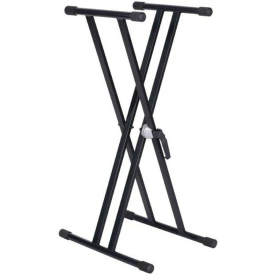 x-Typ Keyboardständer, doppelte Beine, geeignet für alle gängigen Keyboardtypen und Digitalpianos, höhenverstellbar von 170 bis 990 mm, Schnellspannhebelsystem für sofortigen Positionswechsel, gummierte Auflageflächen, Belastbarkeit 50 kg, Farbe schwarz.