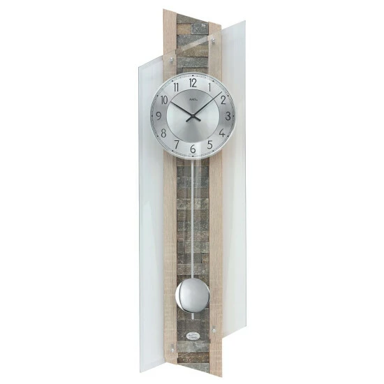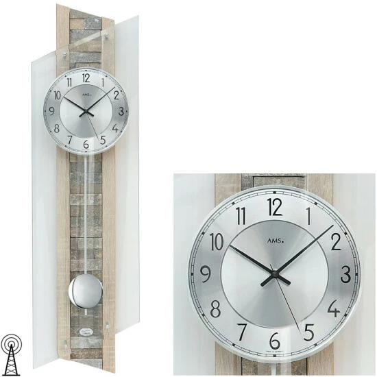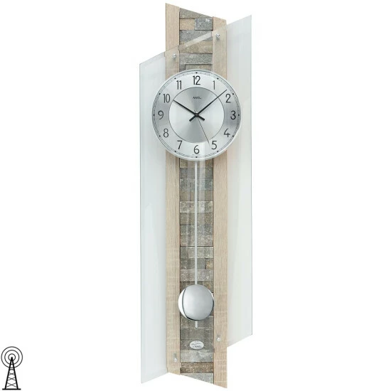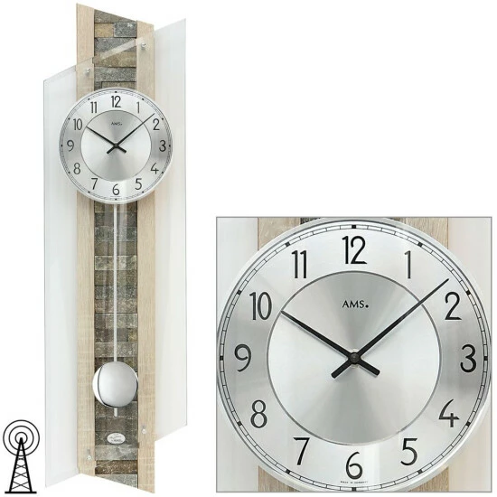 Pendeluhr Funk AMS 5224 mit Funk-Pendelwerk, Holzgehäuse Sonoma-Applikation, Naturstein-Einlage, Aluminiumzifferblatt und facettgeschliffenem geschwungenem Mineralglas