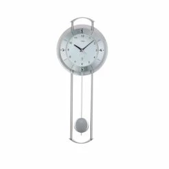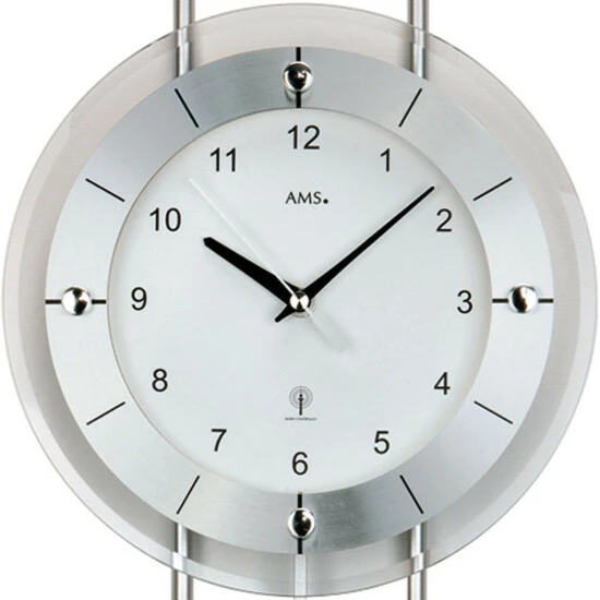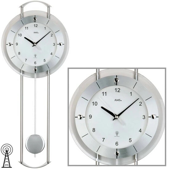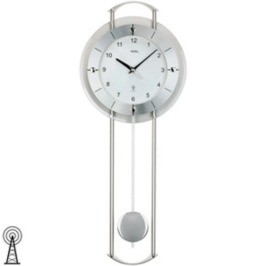 AMS 5254 Wanduhr Funk Funkwanduhr mit Pendel silbern modern Pendeluhr mit Glas