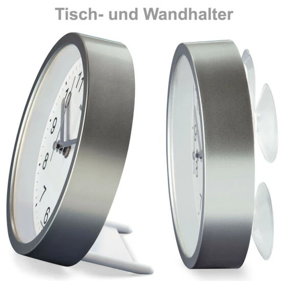 Die Uhr kann als Wanduhr oder Tischuhr eingesetzt werden. Sie kann im Bad mit vier Saugknöpfen an die Fliesen oder an einem Hacken an die Wand befestigt werden. Zum Aufstellen der Uhr ist ein kleiner Ständer vorhanden.