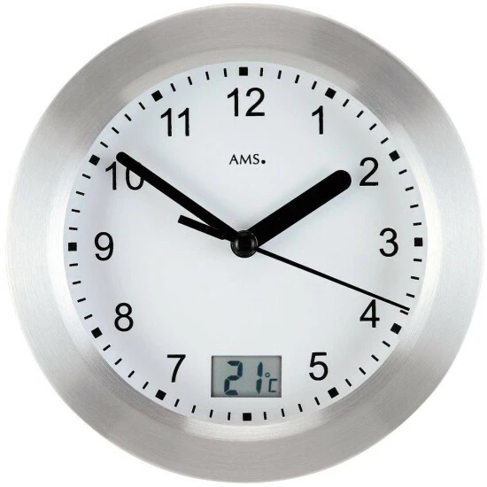 Badezimmeruhr Funk AMS 9223 mit Quartzwerk, Aluminiumfrontreif silber, bedrucktem Zifferblatt, digitaler Temp., Wasserdichte Badeuhr (Wand/Tisch-Ausführung)