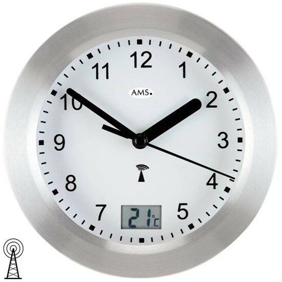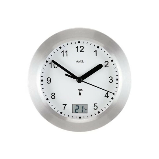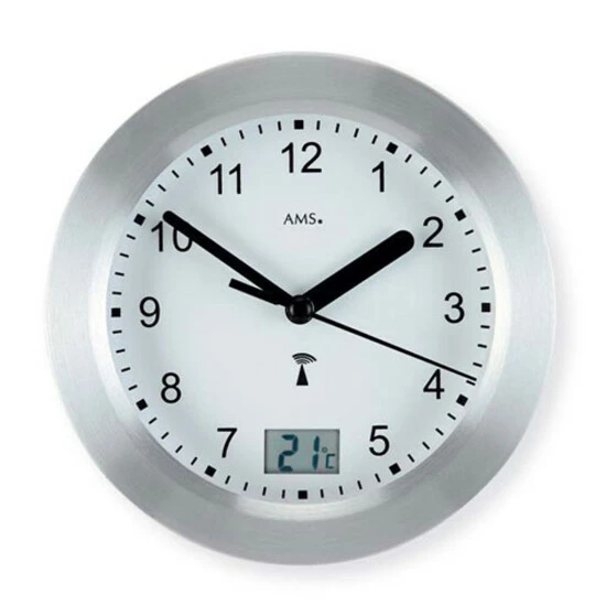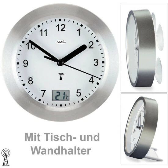 AMS 5923 Wanduhr Baduhr Badezimmeruhr Funk silbern wasserdicht mit Thermometer