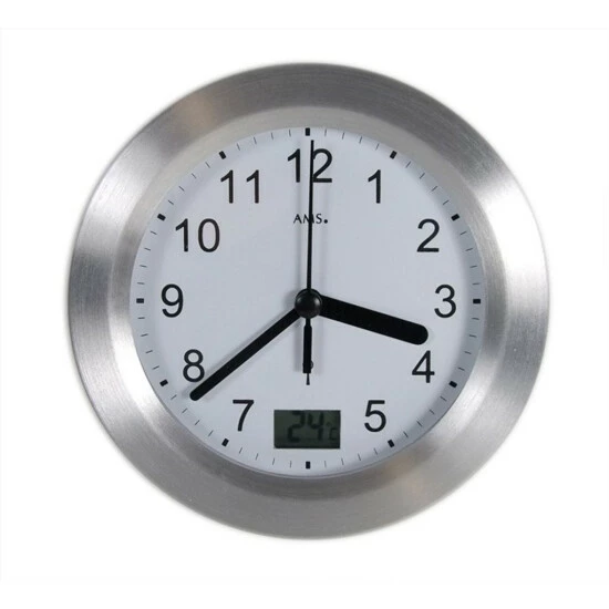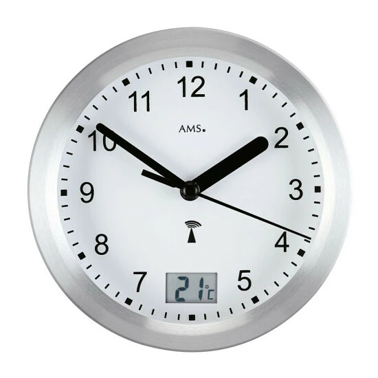 Badezimmeruhr Funk AMS 5923 mit Funkwerk, Aluminiumfrontreif silber, bedrucktem Zifferblatt, digitaler Temp., Wasserdichte Badeuhr (Wand/Tisch-Ausführung)
