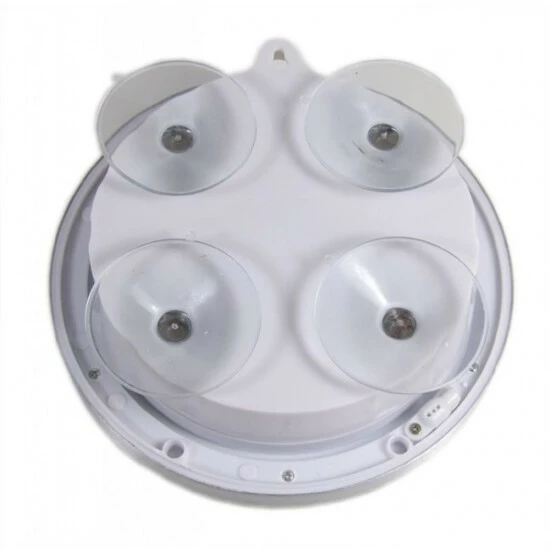 Wasserdichtes, silberfarbenes Kunststoffgehäuse, die Rückseite ist mit 4 Saugnäpfen sowie einer Aufhängeöse für die Wandaufhängung ausgestattet.